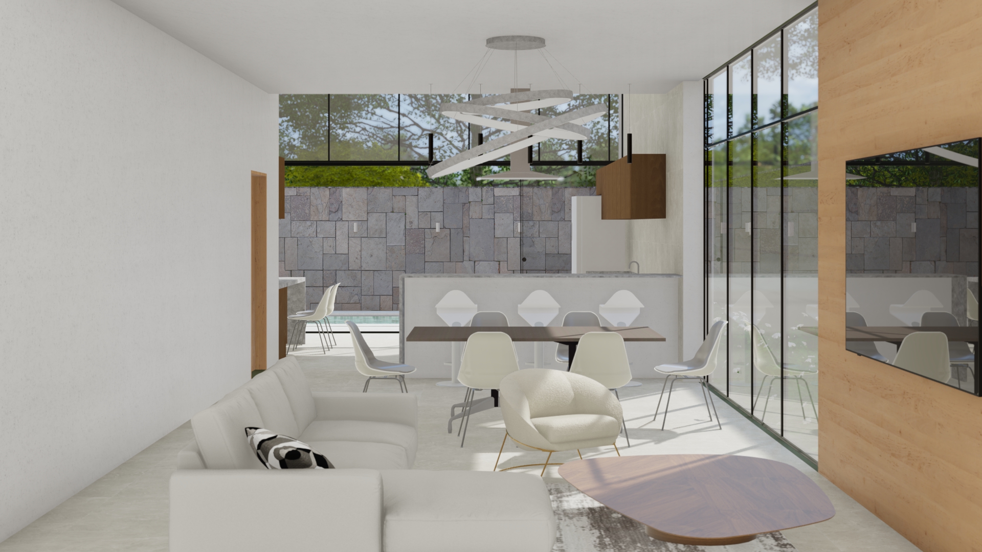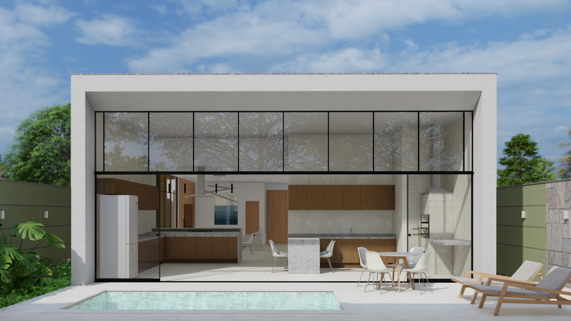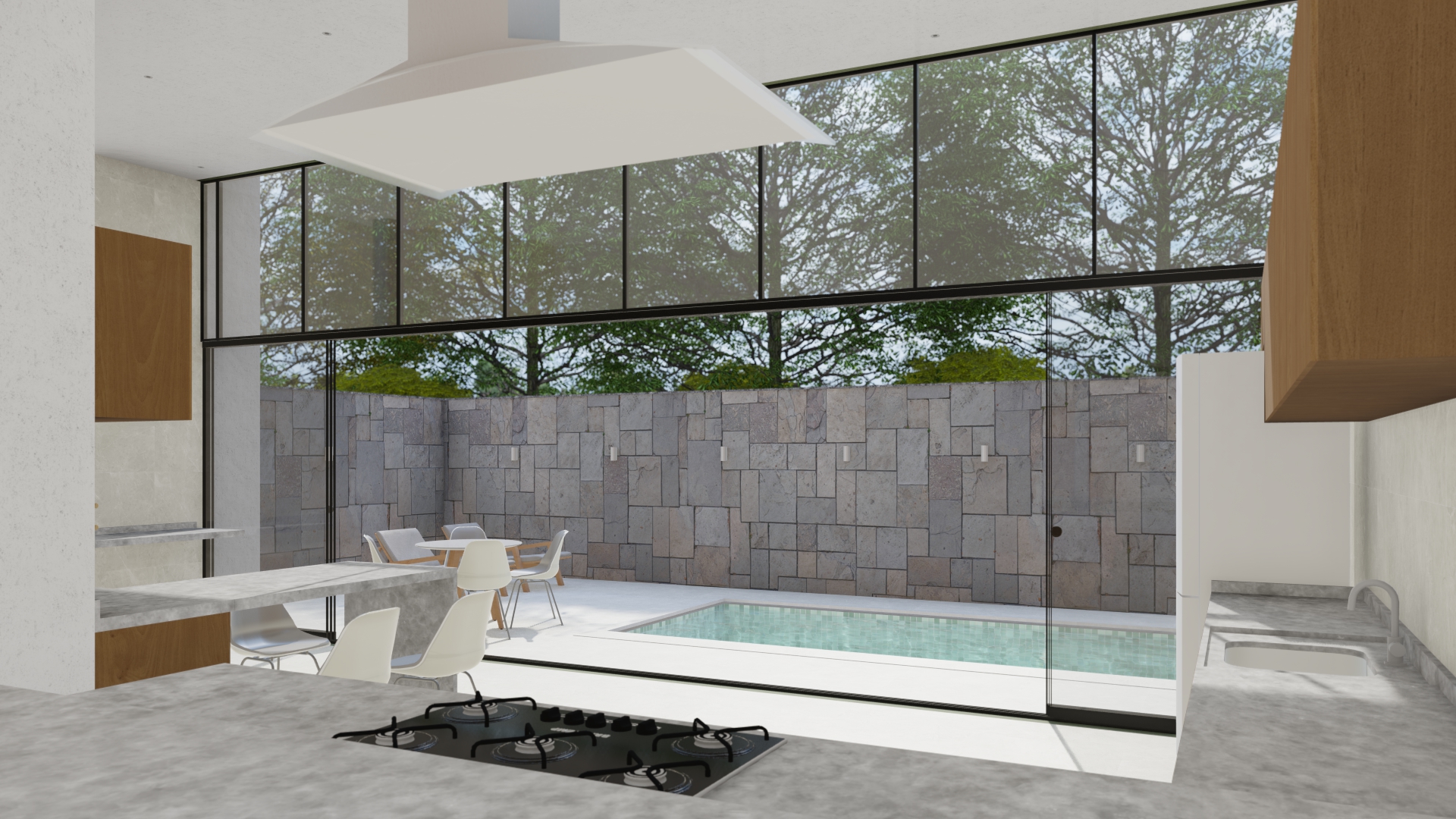 A residência é composta por três pavimentos distribuídos em um terreno inclinado, aproveitando ao máximo as vistas panorâmicas e a luz natural. O primeiro pavimento abriga a área social, com uma ampla sala de estar, jantar e cozinha integrada, todos com acesso direto a um terraço espaçoso que se estende até uma piscina infinita. Grandes portas de vidro deslizantes permitem a fusão entre os espaços internos e externos, promovendo a ventilação natural e criando uma sensação de amplitude.
