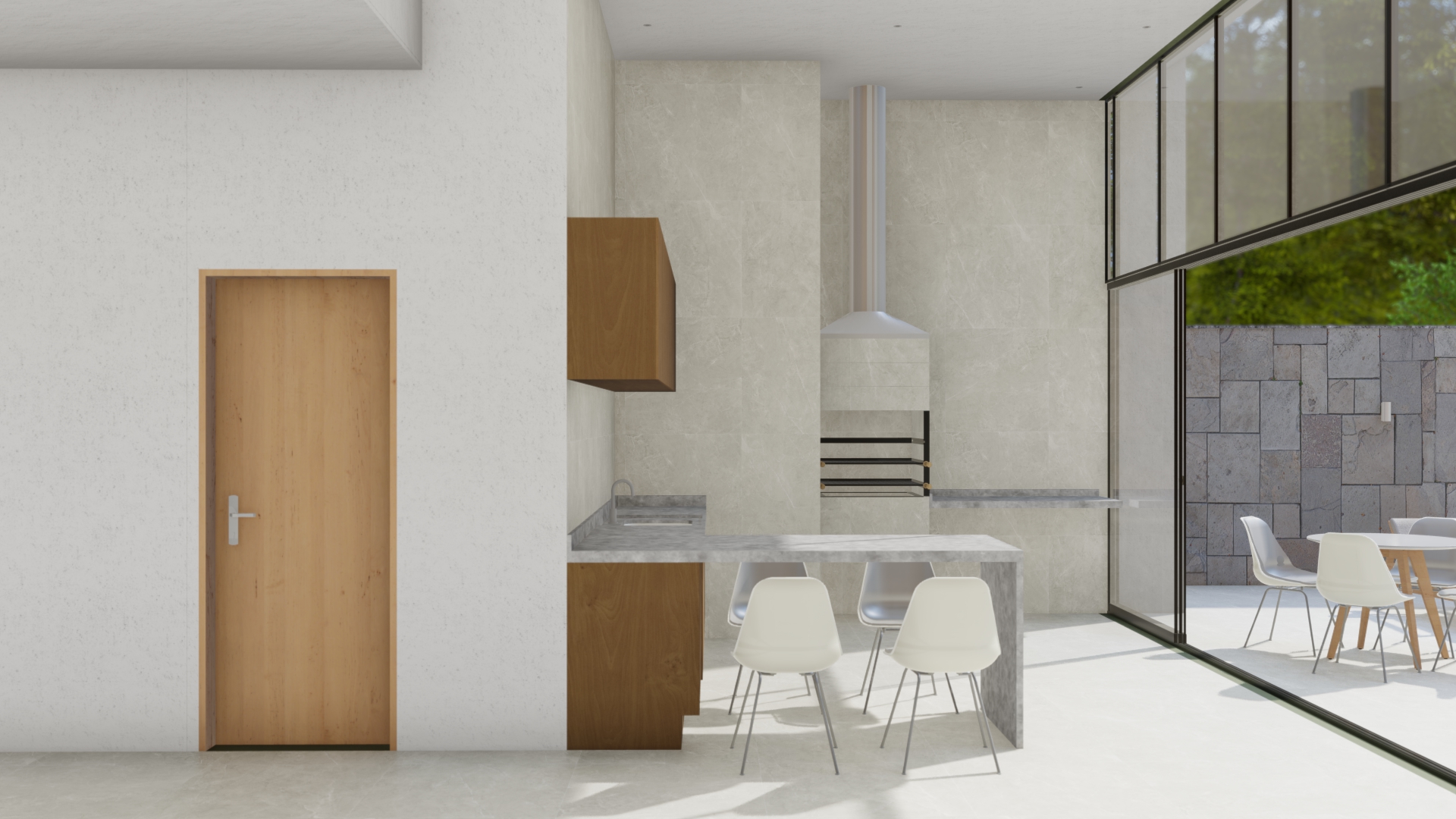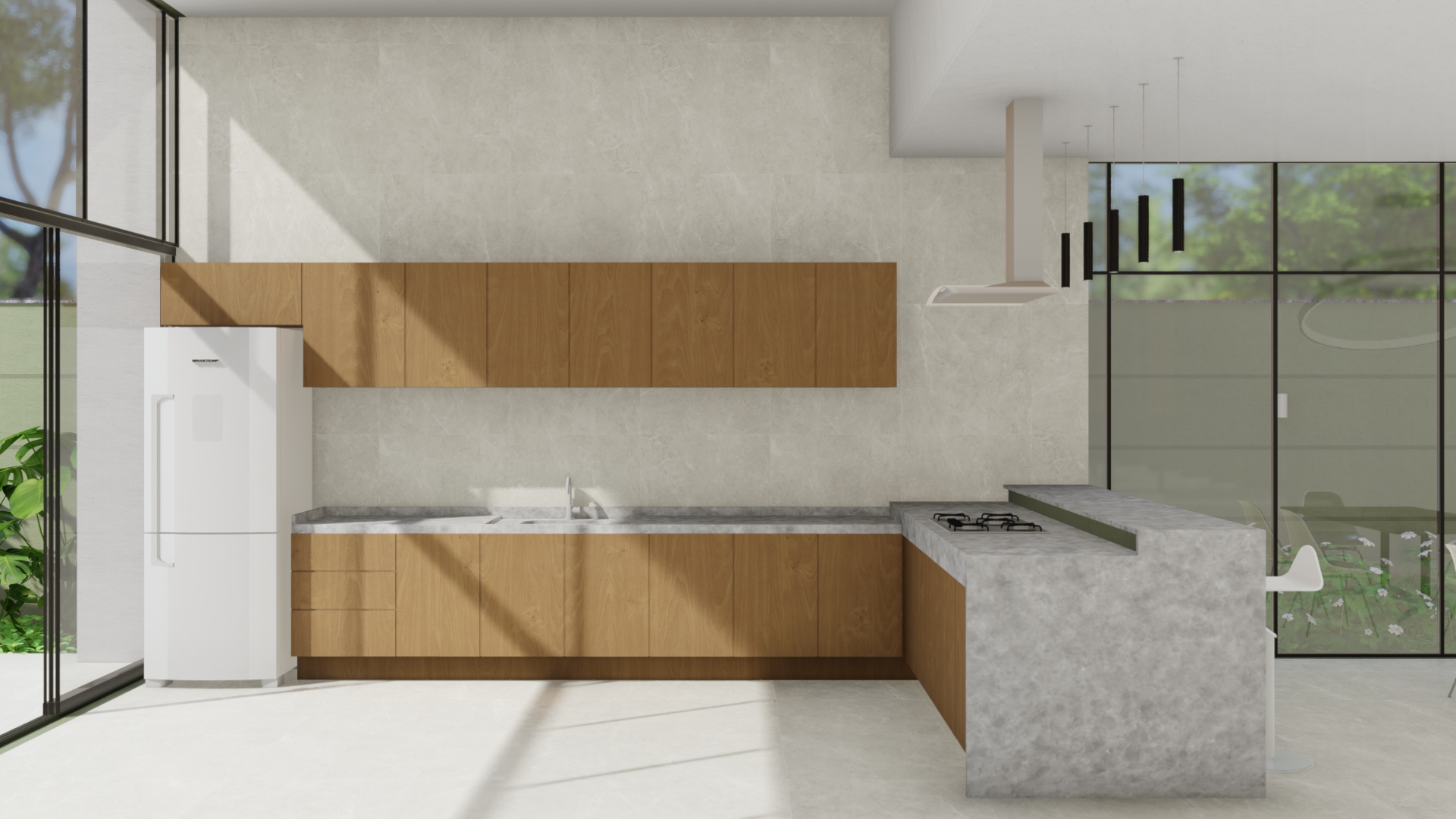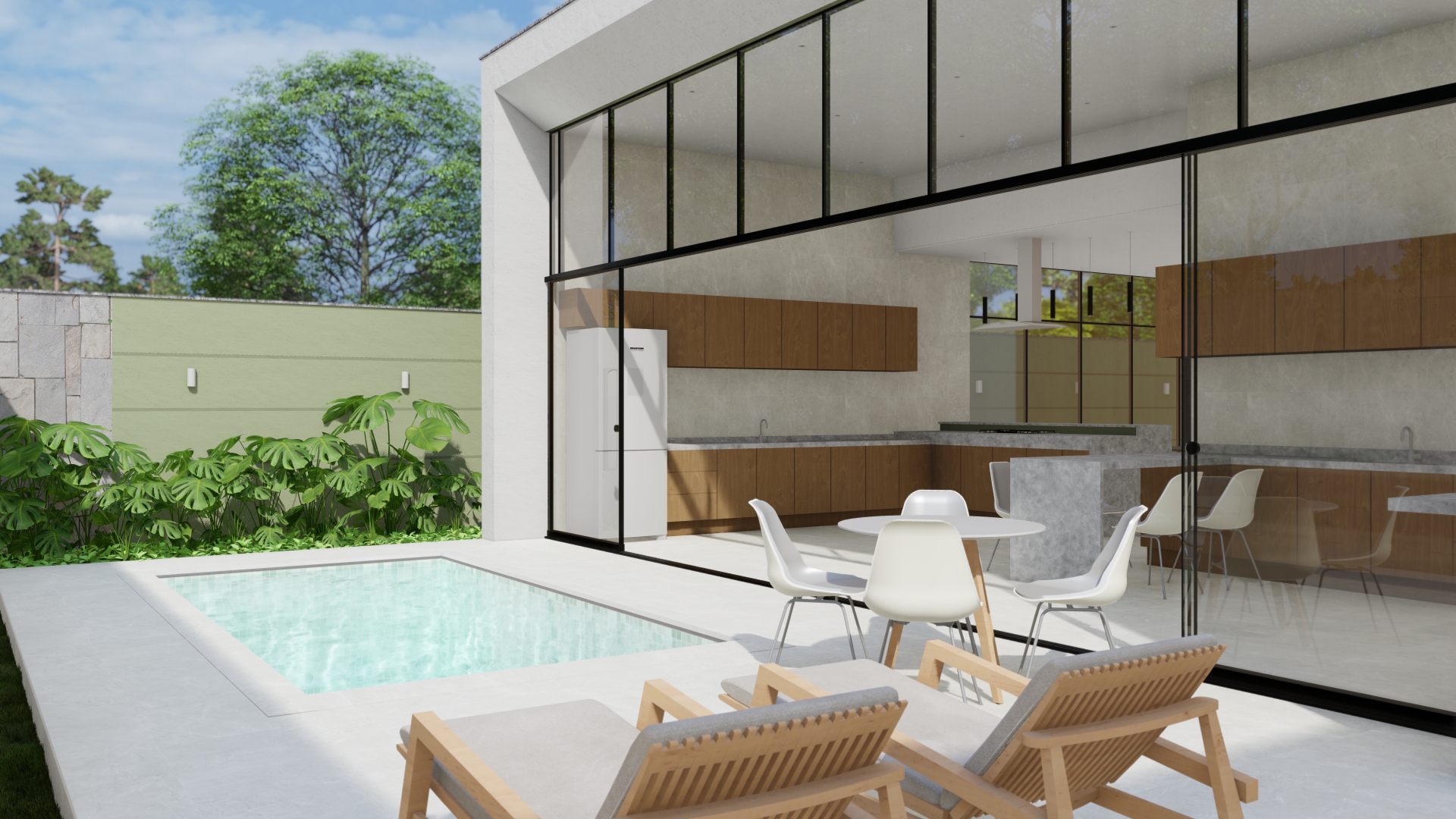 A residência é composta por três pavimentos distribuídos em um terreno inclinado, aproveitando ao máximo as vistas panorâmicas e a luz natural. O primeiro pavimento abriga a área social, com uma ampla sala de estar, jantar e cozinha integrada, todos com acesso direto a um terraço espaçoso que se estende até uma piscina infinita. Grandes portas de vidro deslizantes permitem a fusão entre os espaços internos e externos, promovendo a ventilação natural e criando uma sensação de amplitude.
